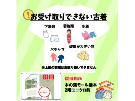 下着類(靴下やタイツも含む)、着物類、水着、パジャマ、大きな汚れや破損があるものはお控えください。