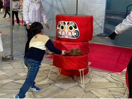 ハンマーを使って巨大なだるま落としにチャレンジ!